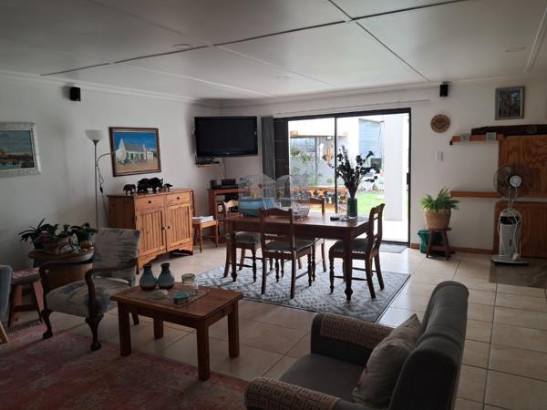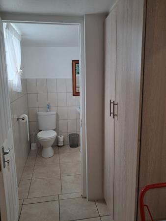 The residence features two comfortable bedrooms and 2 well-appointed bathrooms. The main bedroom offers a serene retreat with a double bed, and practical built-in cupboards for organised storage and has an en-suite bathroom. A ceiling fan ensures comfort, while security bars on the large window provide peace of mind. There is also electric fencing and CCTV cameras in place. Direct access to an outdoor space through sliding doors extends the living area, perfect for enjoying the South African climate.