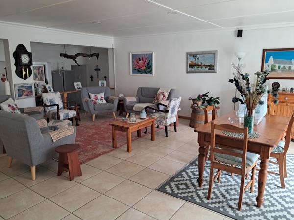 Step inside to discover a spacious and inviting interior, designed for seamless living. The open-plan layout effortlessly connects the lounge, dining, and kitchen areas, all adorned with durable tiled flooring for easy maintenance. The kitchen is a highlight, boasting extensive wooden cabinetry for ample storage, a large window bathing the space in natural light, and a convenient pass-through to the living area. A dedicated pantry room with generous shelving further enhances functionality and the large open plan living area boast an indoor fireplace/braai.
