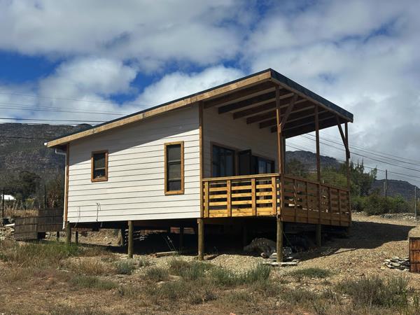 The interior features high ceilings, warm wooden finishes and large windows that invite abundant natural light into the living spaces. An elevated wooden stoep creates a comfortable area for outdoor living and enjoying the surrounding views.