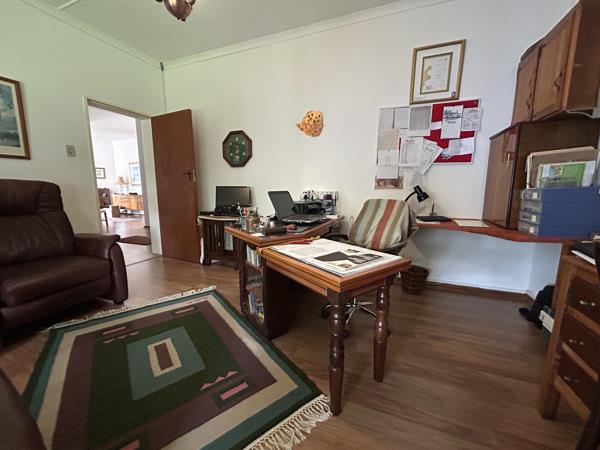 Upon entering the home and going through to the living room, you are greeted with a spacious room where sunlight pours generously into the room through the wide windows, creating a bright and inviting atmosphere. The home boasts laminated flooring throughout, with blinds included in the sale for added convenience and style. Along the hallway, you will find a study for work or leisure, equipped with built-in cupboards. The hallway also features a charming sitting corner as well as built-in linen closets for extra storage space.