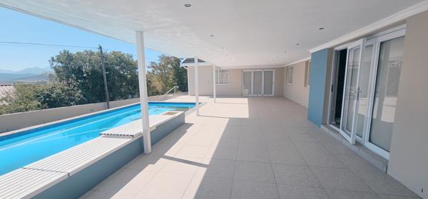 The expansive indoor entertainment lounge features a built-in braai, bar, and pool table with windows that can easily be upgraded to double-length stacking doors, opening the entire space to a covered patio, sparkling pool, and garden with breathtaking mountain views. Ideal for families and entertainers alike.