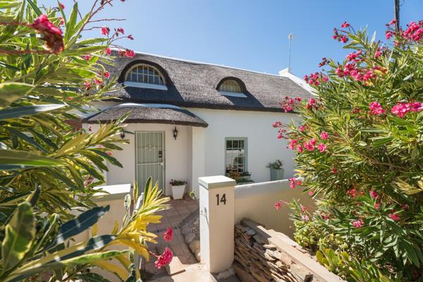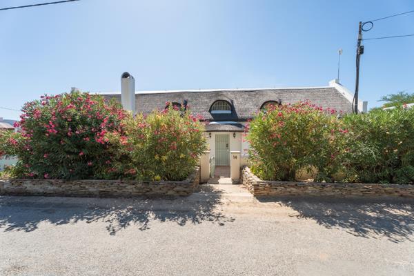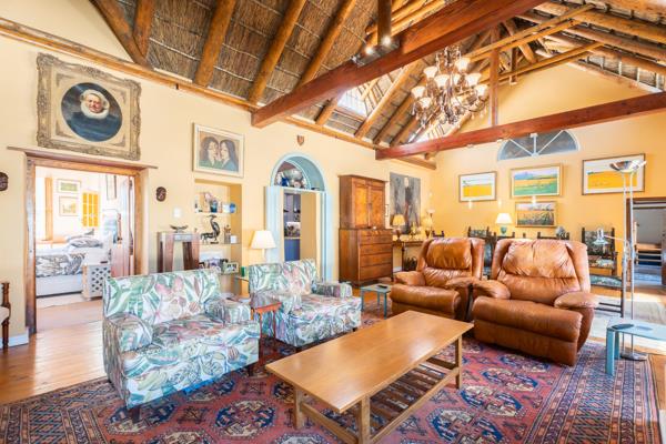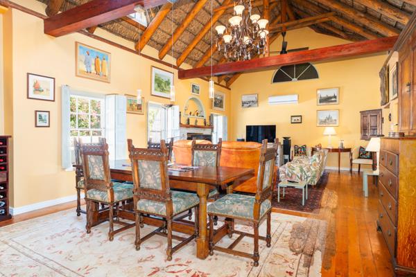 Discover a charming country-style thatched home in the tranquil heart of historic McGregor village. This spacious residence boasts a beautiful lounge dining room featuring wooden beams, open thatched ceilings, a cozy fireplace, and air conditioning. The large master bedroom offers a private door to the patio, an en-suite bathroom with a generous shower, and a dressing room. The second bedroom is equipped with built-in cupboards and an en-suite shower, toilet, and basin. The versatile third bedroom, accessible from outside, includes a loft area perfect for a library or study, and can easily be combined with the second bedroom to create a flatlet. Enjoy a stunning wood "eat-in" kitchen, ideally situated for entertaining, featuring a center island, freestanding gas/electric stove, and granite countertops. A separate study with air conditioning is an ideal work from home office. The outside fitted bar is adjacent to a large undercover patio boasting a fireplace and remote-controlled drop-down blinds which enhance the outdoor living experience.