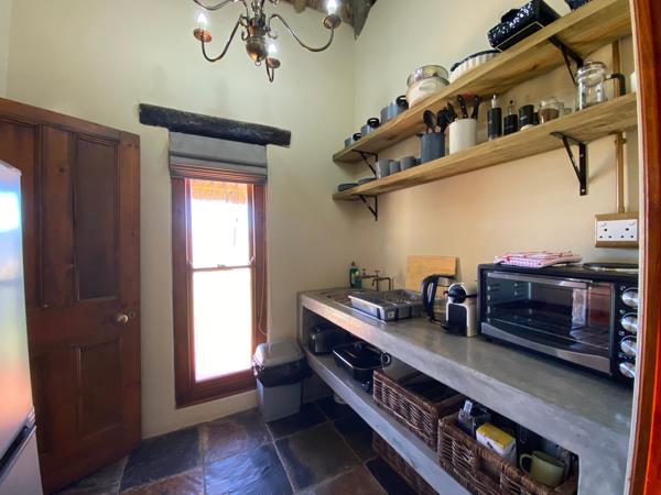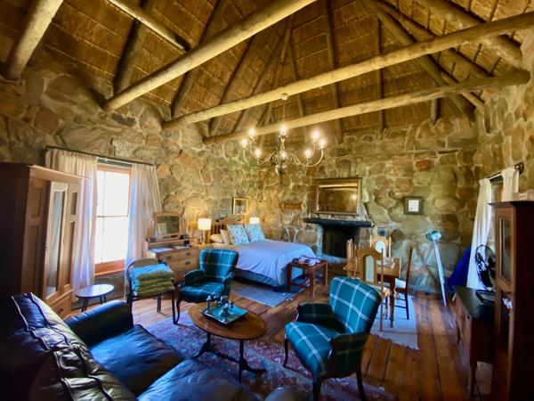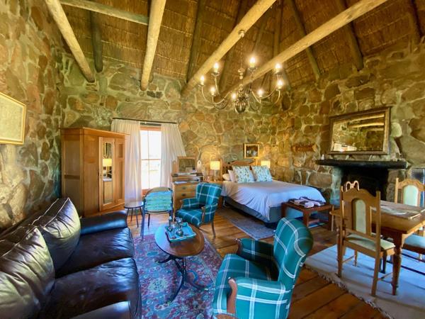 The inviting open-plan bedroom and seating area, has a large wood fireplace and strikingly tall open thatch ceilings, creating an enchanting atmosphere for cozy winter evenings. A full bathroom with large double shower and kitchenette ensure all your needs are met.