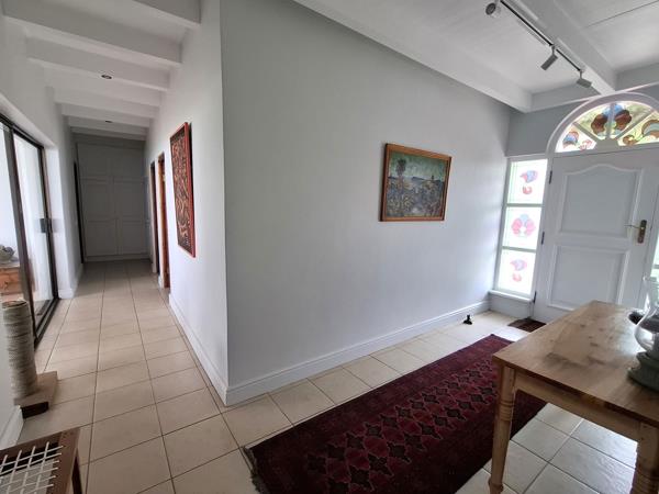 It consists of three bedrooms, of which the master bedroom has a walk-in closet and a en-suite full bathroom. A family bathroom with a shower, basin and toilet serves the other two bedrooms. A stunning family / TV room, with magnificent views,a cosy fireplace, and a feature built-in wall unit, a farm style kitchen - that open towards the back garden and covered patio.