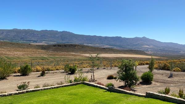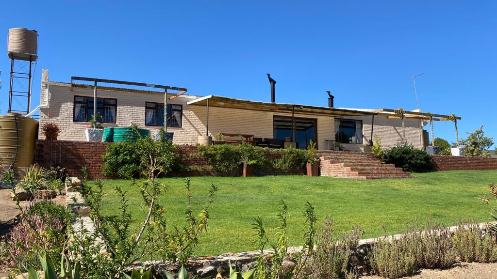 The farmhouse is 445 sqm under roof offers four double bedrooms, main en-suite with a sun room and walk-in dressing room. An enormous living room is open-plan with the kitchen which leads to a pantry, scullery and packing room. The living area has a built-in braai, bar counter in the one corner and a huge central enclosed hearth to warm the whole room when needed. The living room opens onto a covered verandah with glorious views over the farm and surrounding mountains. Look out of Mountain Reedbuck, rabbits and blue crane. The back of the house also has a covered patio. A short distance from the farmhouse are foundations to floor level for another two bedroomed house. There is ample parking for six vehicles in a barn opposite, plus two stables, two pig styes, a feed store and a sheep pen and two Wendy houses for storage. There are various rain harvesting water tanks plus additional 5000 litre water storage tanks.