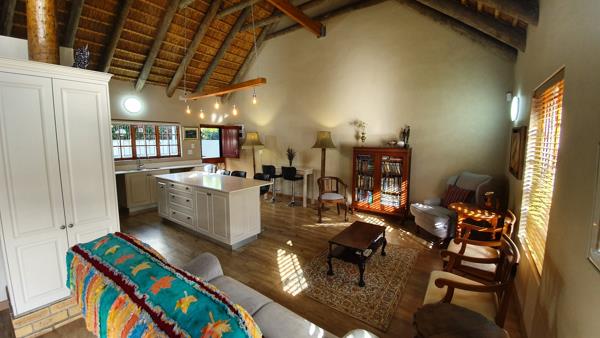 Recent upgrades, including a combed thatched roof, renovated staircase, and newly installed cupboards, ensure that everything is move-in ready. Security features such as Trellidor Clear Guard doors, a built-in safe, and solar power provide peace of mind and efficiency.