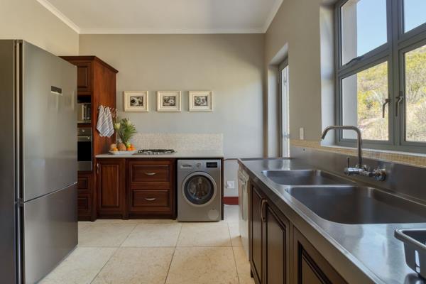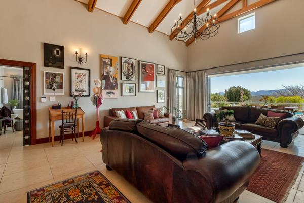 Perched gracefully on the upper level, the main residence unfolds in quiet harmony with her surroundings. Three generously sized bedrooms, each with en-suite bathrooms, open through stacker doors onto the expansive wraparound patio, inviting the mountains and sky to breathe inside. The open-plan living area draws in the vastness of the landscape with double-volume ceilings, a cozy fireplace, and a seamless flow between lounge, dining, and kitchen. The kitchen, adorned with solid rosewood cabinetry, balances beauty and function, while the scullery and walk-in pantry ensure comfort and ease in everyday life.