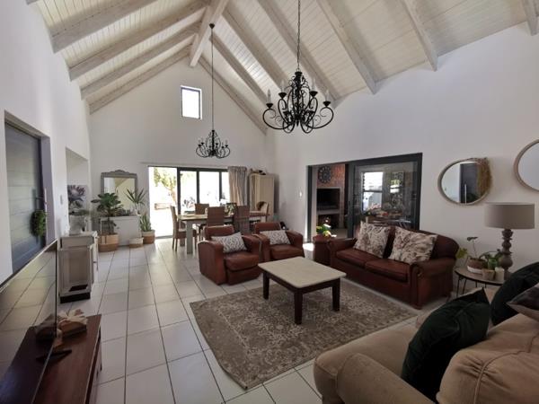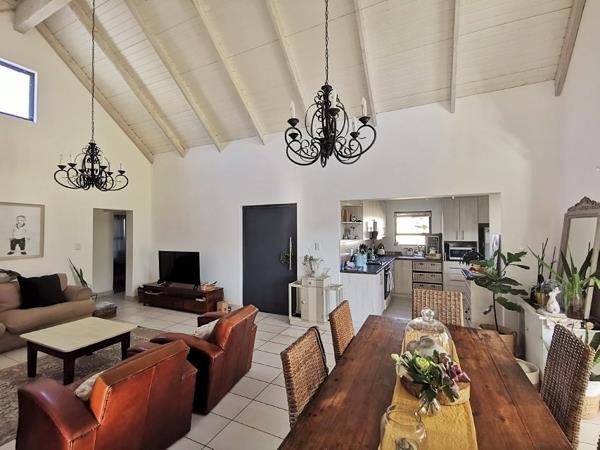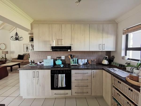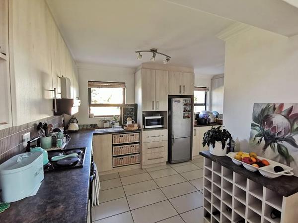The lounge/living space has high volume ceilings and is open plan to the kitchen with ample built in cupboards and a fitted stove/oven. A separate scullery ensures a neat kitchen and accommodates additional appliances. A sliding door separates the spacious braai room with built in braai from the living area and this room opens up onto the patio with an outside built in braai and small garden. The single garage is adjacent to a covered parking space.