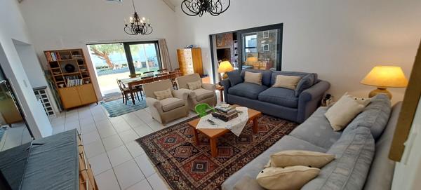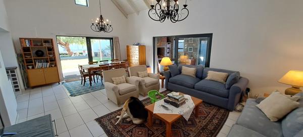 The open plan living area is spacious with high ceilings and a sliding door that opens to the inside build-in braai area that leads to the patio where you will find a build-in braai for outside entertaining