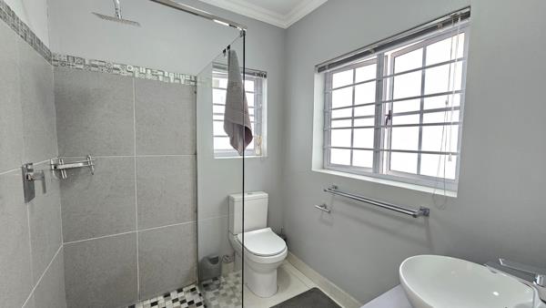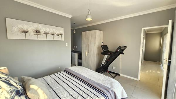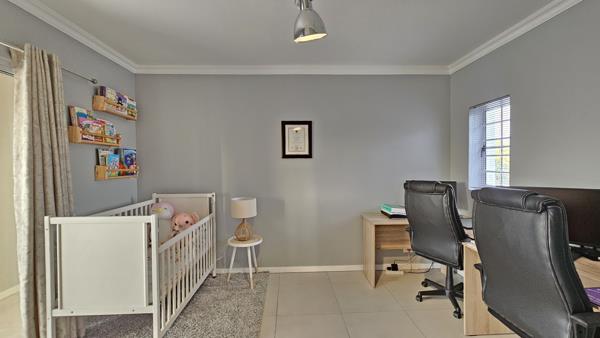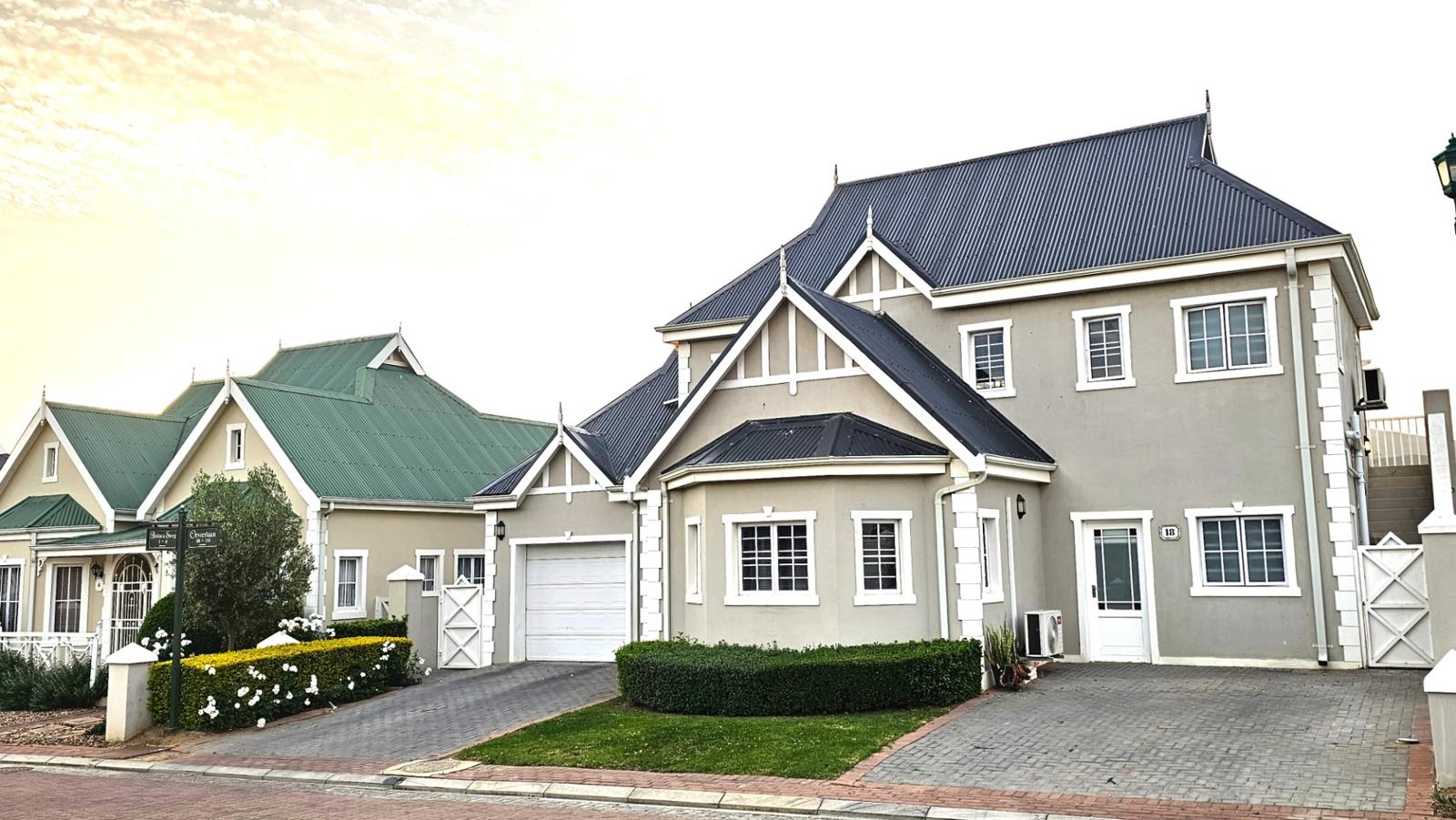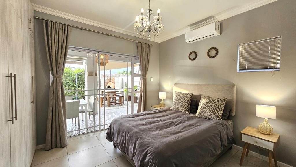 The ground floor includes an air-conditioned en-suite bedroom that opens onto the back patio. The splash pool and built-in braai complement the low-maintenance garden. Upstairs, a balcony provides a lovely spot to take in the Langeberg Mountain views. Two additional en-suite bedrooms complete this level. The upper floor can be accessed via an internal staircase or an external one, offering added convenience and flexibility. An automated garage with direct access into the home, offers space for washing appliances and opens through to the back garden for easy access. Additional features include a gas hob, under-stair storage, water tank, fibre connection, alarm system, and two dedicated parking bays in front of the home.