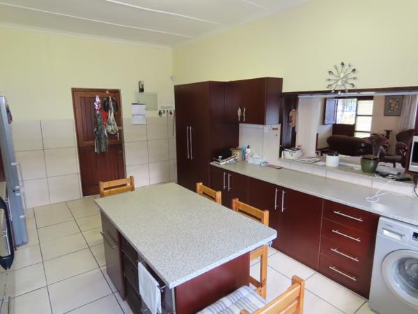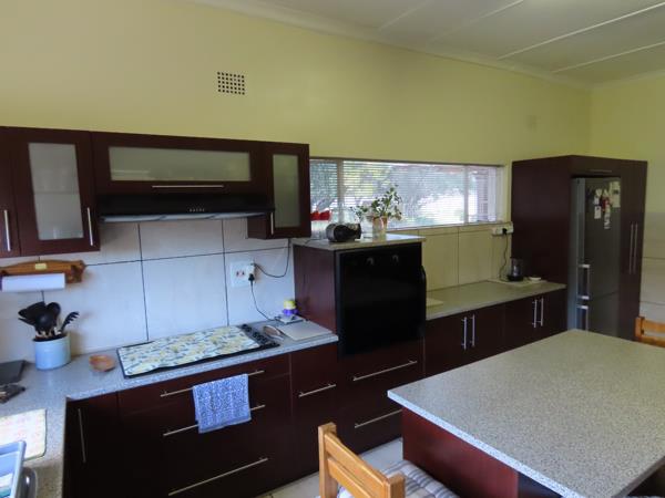 The open-plan lounge and dining area flow into a well-equipped farm-style kitchen with ample cupboards, a built-in oven and hob, extractor fan, freestanding counter, serving window and dishwasher connection. From here, step out to a covered patio overlooking a sparkling fiberglass pool, mountain views and large, fully enclosed garden perfect for children and pets.