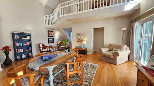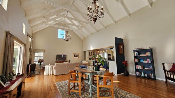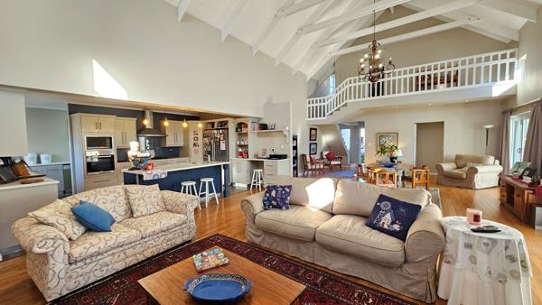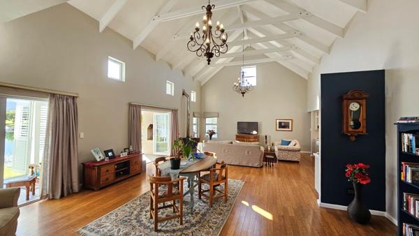Situated in a prime position within a secure and sought-after estate, this north-facing home offers views over a pond and the majestic Langeberg Mountains. Designed for both indoor and outdoor living, this home is a true showstopper. The double-volume living area, with fireplace, provides ample space for a lounge and dining room and is open plan to the modern kitchen. The kitchen is equipped with a gas hob, electric oven, and generous cupboard space. A separate scullery offers space for multiple appliances, while a nearby laundry room adds to the homes functionality. This home features three spacious bedrooms and three modern bathrooms. The master suite is a standout, with large windows that frame the pond and flood the room with natural light.