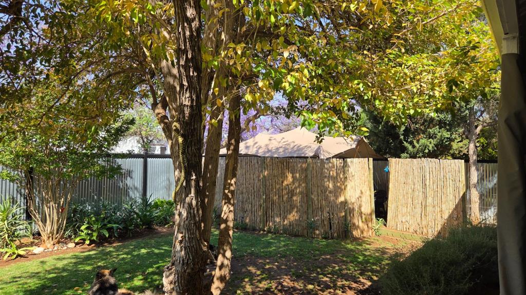 A lush, established garden filled with mature trees that create a sense of calm and seclusion.