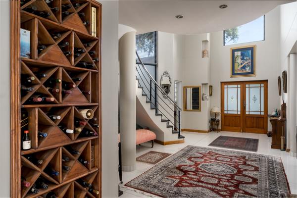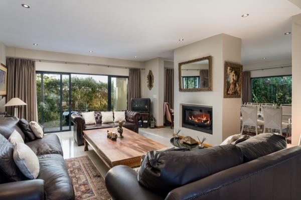 The lovely double volume entrance with large eat windows overlooks a green garden and forms part of the semi-open plan lounge and dining room with shared combustion fireplace These rooms have sliding doors onto the patio with built-in braai that flows into the very Indigenous garden and wooden deck set in the beautiful natural garden with load of bird life.