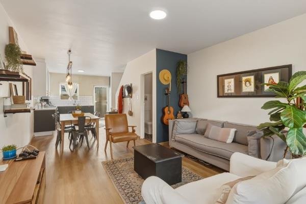 -The apartment features a spacious open-plan lounge and dining area that flows seamlessly into a modern kitchen.