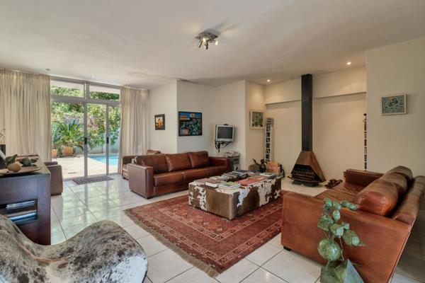 The lounge flanks the dining room, offering generous proportions and a warm focal point with a Jetmaster fireplace.