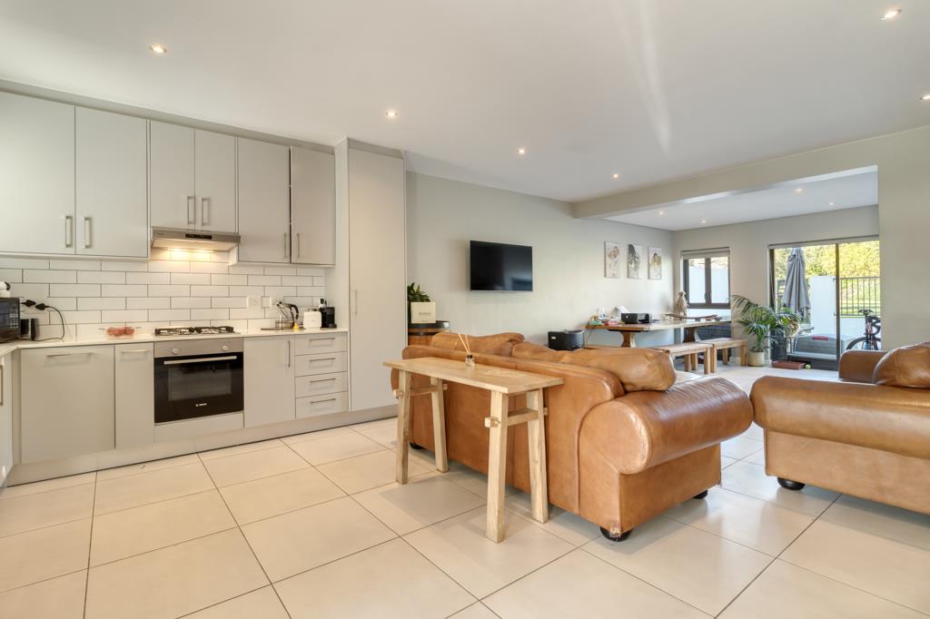 The ground level showcases a spacious open-concept layout that integrates the kitchen, dining, and lounge areas ideal for effortless entertaining and relaxed family moments. A built-in braai enhances the indoor-outdoor connection, while the kitchen is equipped with streamlined cabinetry, a hob, electric oven, and extractor fan.
