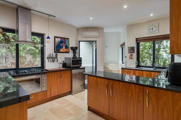 Inside, the residence is a showcase of thoughtful design and comfort. The living spaces flow effortlessly, anchored by a beautifully crafted kitchen and warmed by a mix of fireplaces and underfloor heating throughout. Natural materials and quality finishes give the home a grounded elegance without ever feeling overdone. The layout is versatile and accommodating, with four spacious bedroomseach with its own bathroomincluding a fully equipped private suite ideal for guests or extended family. With features like solar power, a triple garage, a Jacuzzi, and sophisticated climate control, this home offers a seamless blend of eco-conscious living and modern luxury in one of Somerset Wests most coveted communities.