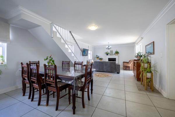 The open plan living space is warm and inviting, with a spacious dining area and lounge featuring a cozy fireplace that flows into an enclosed braai room. This versatile space opens to the back garden and is perfect for year-round gatherings with family and friends. A guest toilet on the lower level ensures convenience for visitors while keeping the upstairs private.