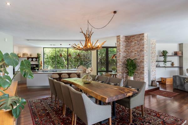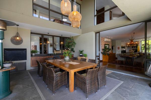 Step through the striking wooden doors into the double-volume entrance hall, where open spaces and unique architectural details set the tone for the home. The kitchen flows effortlessly into the dining and living areas, which open onto the impressive braai patio and private garden. Thoughtful design elementsincluding double-volume ceilings, large windows, and aluminium and glass cavity sliding doorscreate airy yet intimate living spaces bathed in natural light.