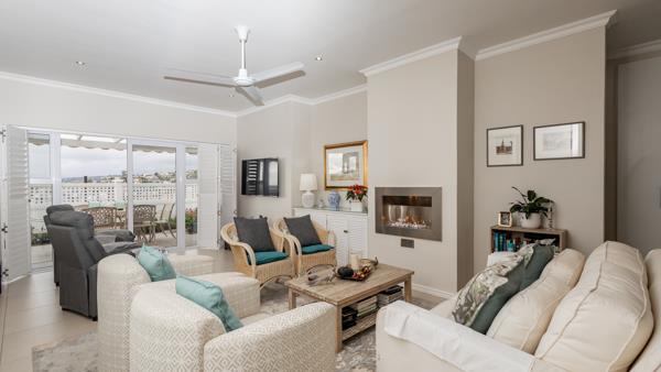 The spacious living area features a gas fireplace and flows seamlessly onto