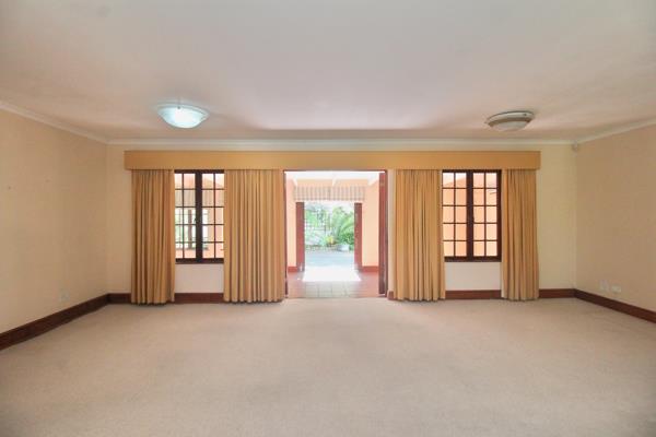 -Large sunroom TV room air conditioner with double doors opening onto private garden.