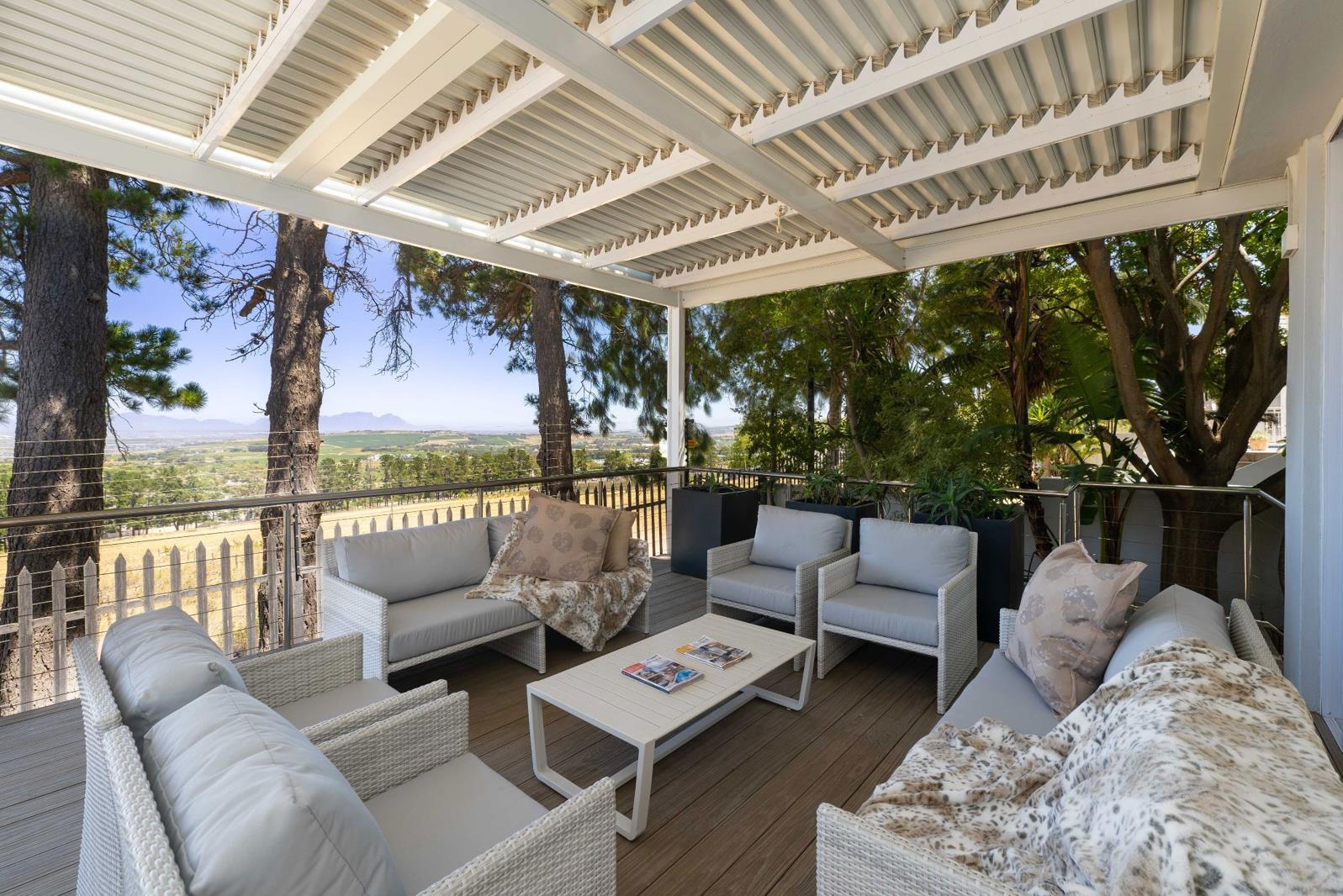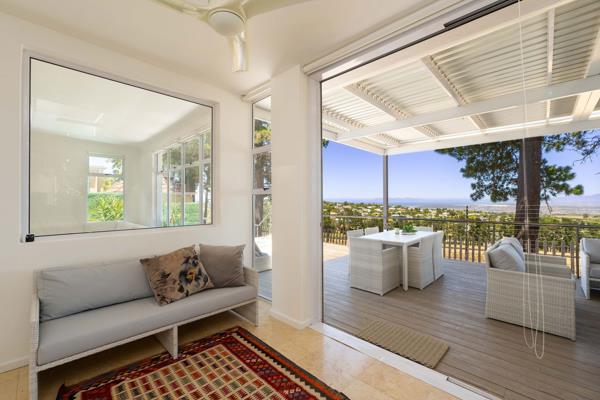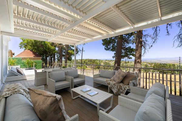 The sunroom, complete with an indoor braai, flows seamlessly through large sliding doors onto an expansive deck, partially covered, where you can relax or entertain while overlooking the sparkling pool and soaking in the panoramic views, complemented by an outdoor patio constructed using durable low-maintenance hardwood, with an aluminium shutter roof and uninterrupted views overlooking Table Mountain..