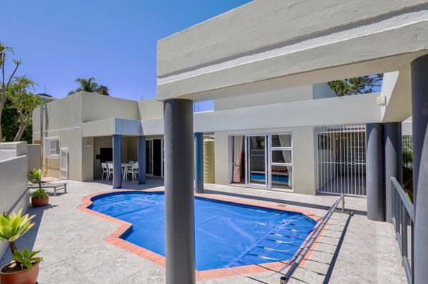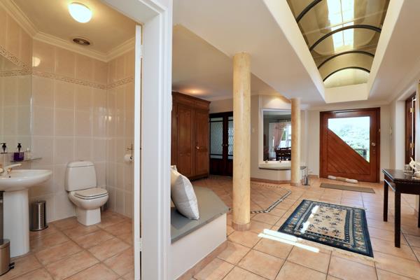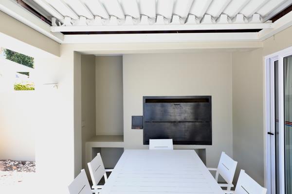 Private dining room with direct access to the pool area, a separate study, guest toilet, spacious TVLiving room with direct access to a covered braai area and sparkling pool. The spacious, well - equipped kitchen features solid Beachwood cabinetry, new double oven, hob and extractor, granite countertops, and a separate laundry and scullery with new double wash basin, and Pellet Heater that heats up the hole kitchen scullery area.