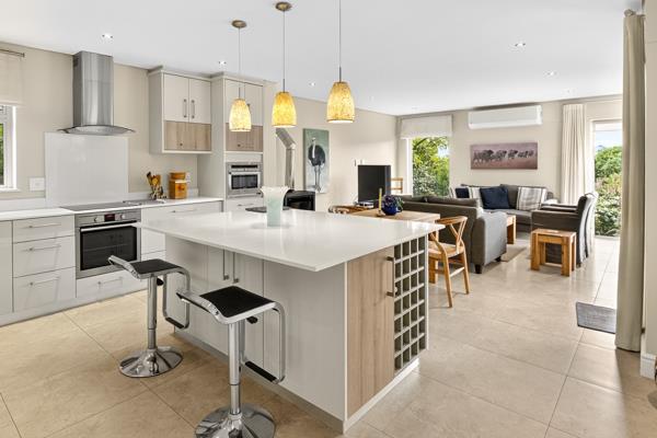 The main living area consists of an open plan lounge, dining room and kitchen. In the lounge, a corner window and a second west facing window extend to the floor allowing a lot of sunlight to enter the room. The windows look out onto the conservation area with all its natural vegetation. There is a central free standing slow combustion fireplace and an aircon in this lounge. The lounge opens up via stacking doors to the undercover patio. The large patio will allow for an outside dining table and large outdoor patio suite. There is a built in braai, protected from wind and rain.