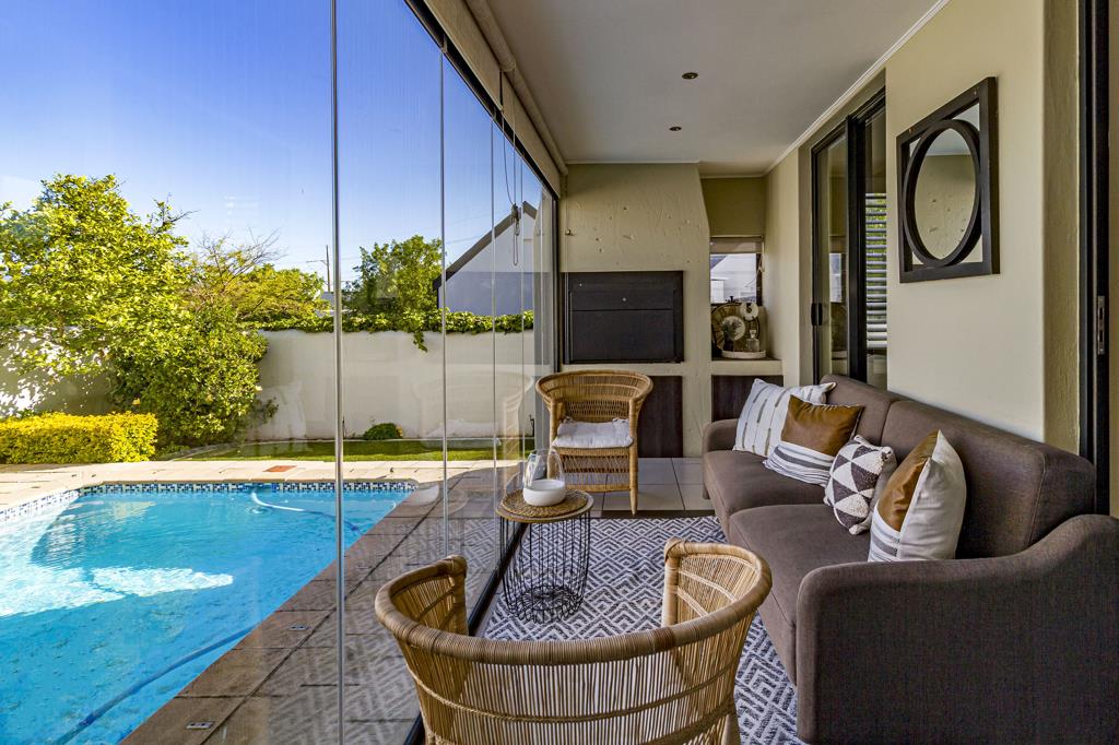The enclosed patio with frameless glass stack doors and a built-in braai overlooks the sparkling pool and manicured garden, creating an ideal space for relaxed indoor-outdoor living. Two water tanks are neatly positioned on the side of the home, adding to its practicality.
