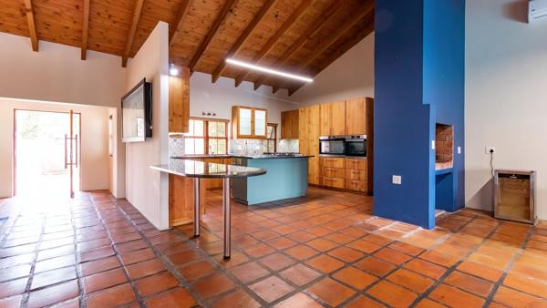 The main residence features three spacious bedrooms and two-and-a-half bathrooms. Its heart is a generous open plan living and dining area with terracotta tiles, exposed rafters, a fireplace, built-in braai, and climate control. Stacking doors open seamlessly to a shaded veranda and pool deck, where a salt-chlorine pool with heat pump takes in sweeping views of the Helderberg Mountains and False Bay.