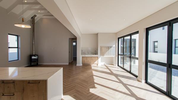 The expansive open-plan layout is designed for modern lifestyles, with a contemporary kitchen that includes a central island, elegant stone countertops, a gas hob and oven, and a fully equipped scullery with appliance-ready fittings. The spacious living area is bathed in natural light and enhanced by a combustion fireplace, creating a warm and inviting ambiance throughout the year.