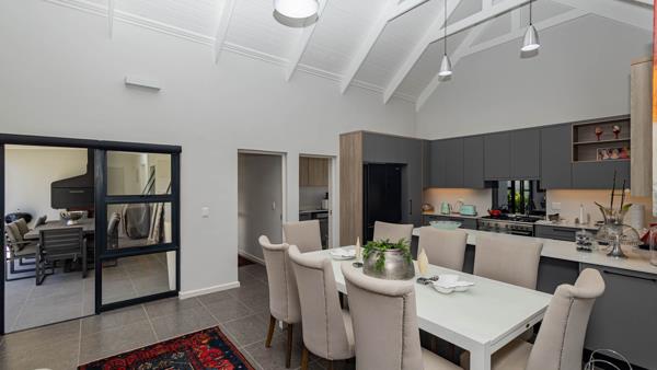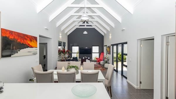 The home features an open plan layout that flows effortlessly between the kitchen, dining, and living areas, all enhanced by high ceilings and abundant natural light. The modern kitchen is equipped with premium finishes, sleek cabinetry, and quality appliances, perfect for both family living and entertaining.