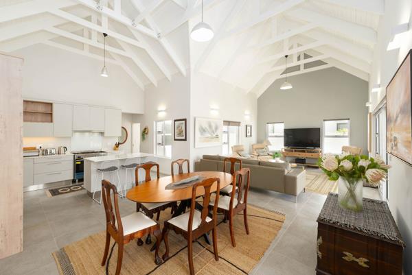 Light and bright open plan living room and dining room with high ceilings.