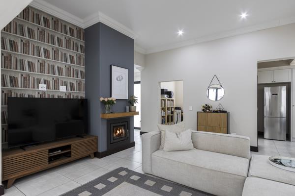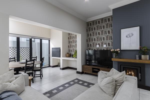 The spacious open-plan lounge features a wood-burning fireplace and leads into an enclosed entertainment room with a built-in braai and stacker doors that open to the private outdoor space.