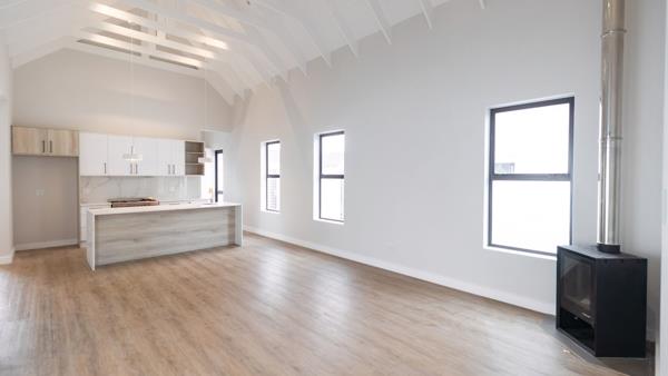 The expansive 199m2 open-plan layout is designed for modern lifestyles, with a contemporary kitchen that includes a central island, elegant stone countertops, a gas hob and oven, and a fully equipped scullery with appliance-ready fittings. The spacious living area is bathed in natural light and enhanced by a combustion fireplace, creating a warm and inviting ambiance throughout the year.