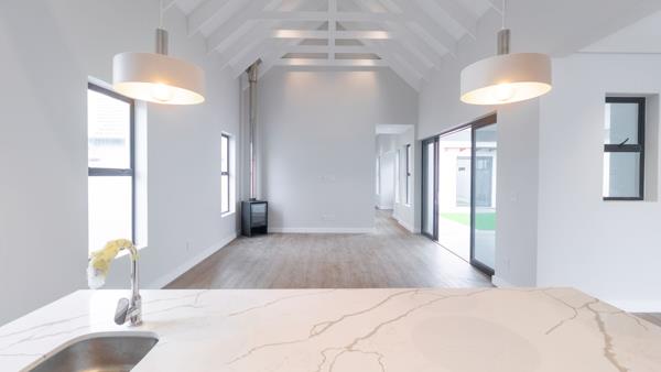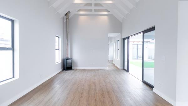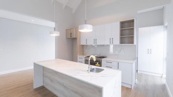 The expansive 220m2 open-plan layout is designed for modern lifestyles, with a contemporary kitchen that includes a central island, elegant stone countertops, a gas hob and oven, and a fully equipped scullery with appliance-ready fittings. The spacious living area is bathed in natural light and enhanced by a combustion fireplace, creating a warm and inviting ambiance throughout the year.