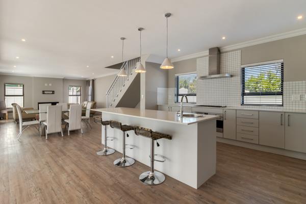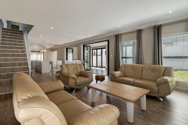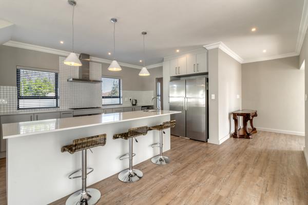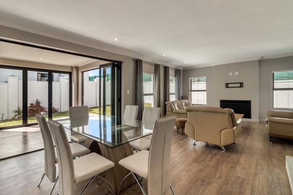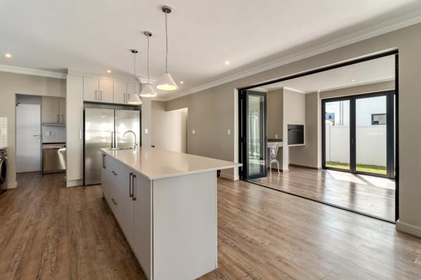 The sleek, modern kitchen sets the tone finished in crisp white with a gas hob, ample storage, and a separate scullery for added practicality. The kitchen flows seamlessly into the open-plan dining and lounge area, creating a bright, welcoming space for family living. Stacker doors extend the living area to a spacious enclosed patio with built-in braai, opening onto a private garden ideal for entertaining or enjoying quiet moments outdoors.