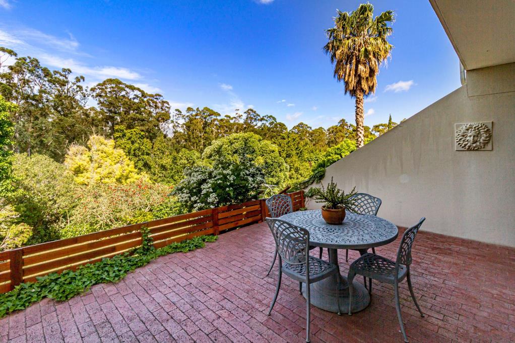 An open-plan entrance on the lower level flows seamlessly into the light-filled dining, living and kitchen areas. Double French doors open up to a large veranda overlooking the tree-filled valley this setting is ideal for early morning coffees, brunches or romantic dinners under the stars. A private staircase leads down to a lush communal garden for afternoon walks. When the dining and living room windows are all opened on a sunny day, you enjoy 180-degree tree-top views.