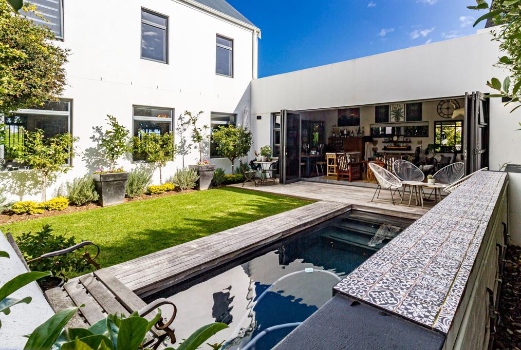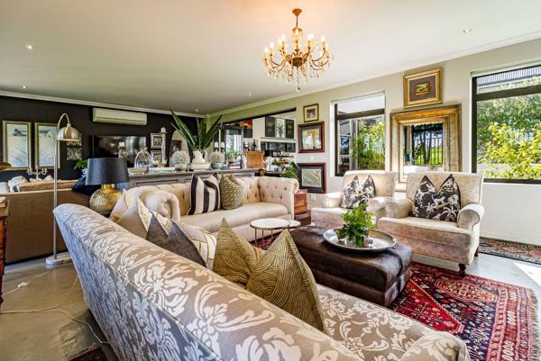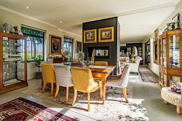 At the heart of the home lies a welcoming braai room with a large, open wood-burning fireplace, ideal for relaxed entertaining. This space opens seamlessly onto a private garden and sparkling swimming pool, creating a tranquil outdoor haven.