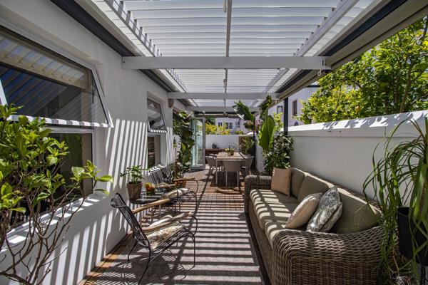 The open-plan layout connects a stylish kitchen, cosy living area with slow-combustion fireplace, and a sunny braai room that opens to a private patio with louvered roof perfect for year-round entertaining.