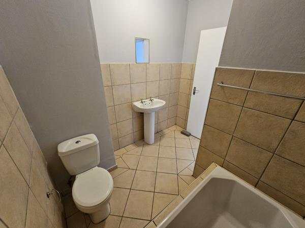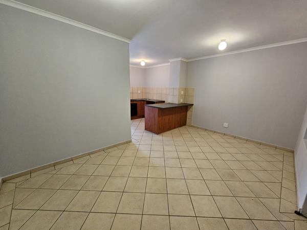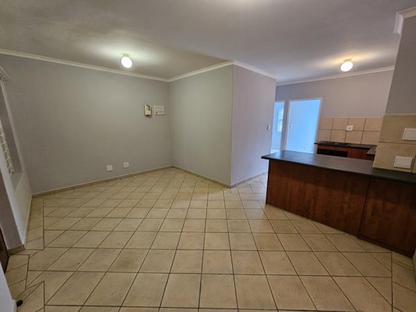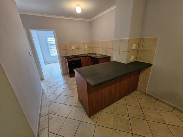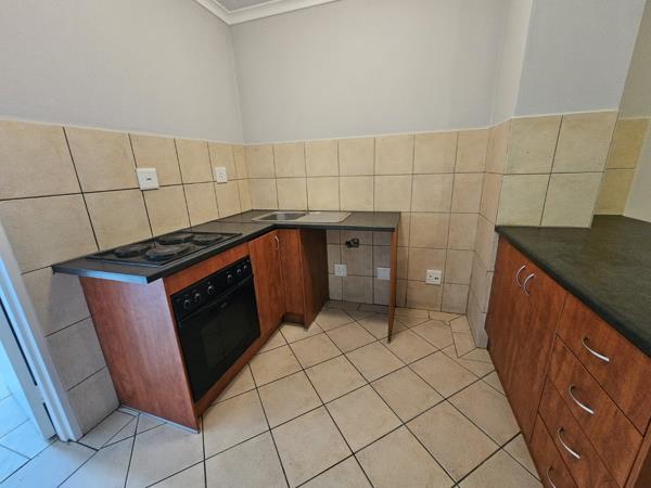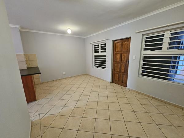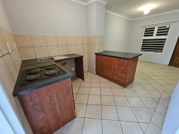 The apartment is tiled throughout with an open-plan kitchen offering an under-counter oven and hob, basin, and washing machine connection. Both rooms offer built-in cupboards with one shared bathroom. Burglar bars cover each window, and the front door is secured with a sliding safety gate.