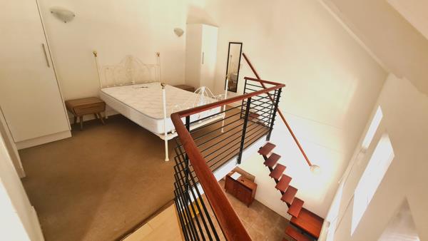 A floating staircase with rich wooden treads and bold black metal supports leads to the airy mezzanine loft, a compact workspace under the slanted ceiling, and a built-in wardrobe for streamlined storage. The industrial-style railing keeps the space open and connected to the living area below, while maintaining privacy and comfort.