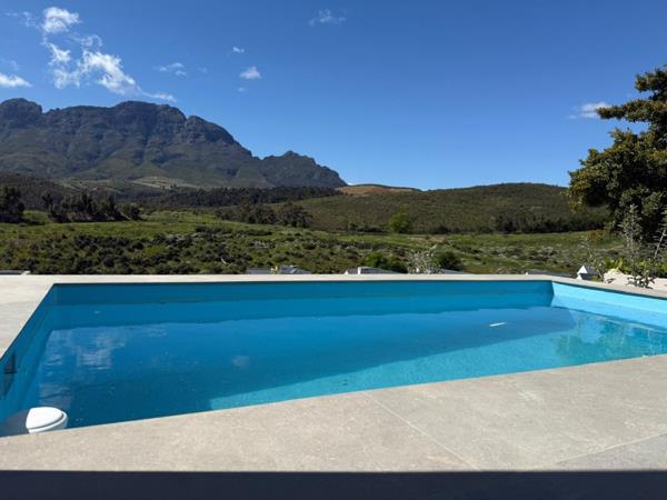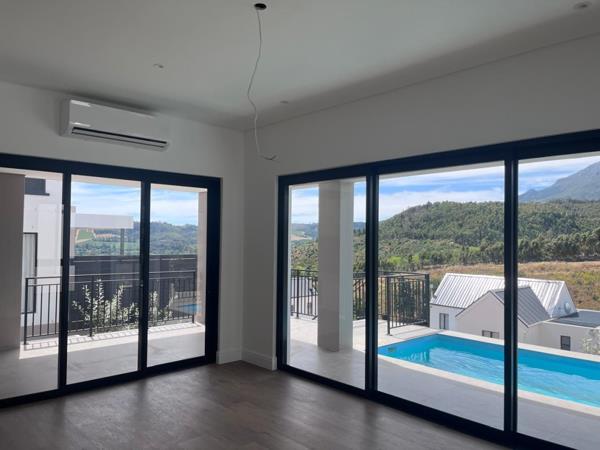 For outdoor living, enjoy a covered patio with a built-in braai and a swimming pool with a heat pump, perfect for year-round use. The estate itself offers secure, scenic surroundings, with walking and cycling paths overlooking renowned wine farms and nature reserves.
