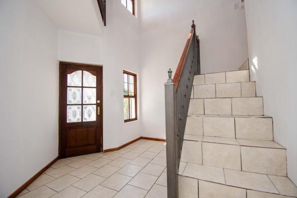 The home boasts 2.5 modern bathrooms, an open-plan living and kitchen area ideal for shared living or family gatherings, and a large L-shaped garden perfect for children or outdoor entertainment. A gas geyser ensures energy efficiency, while a double-volume garage accommodates up to four vehicles with ample storage space, including a separate storeroom.