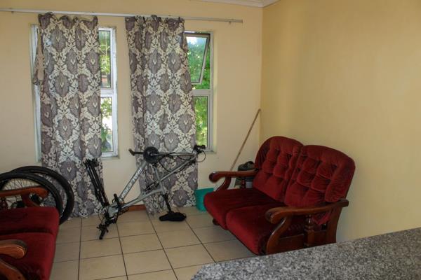 Open-plan tiled lounge and kitchen with built-in cupboards