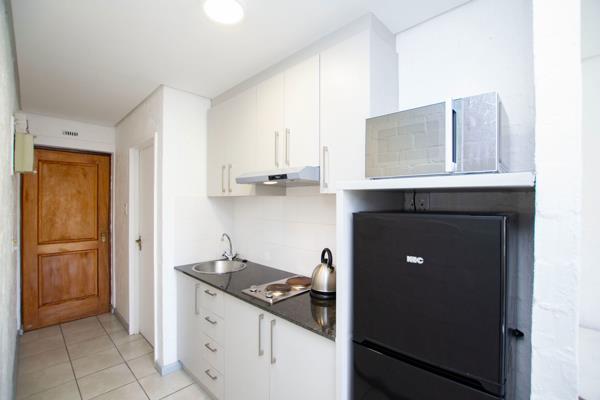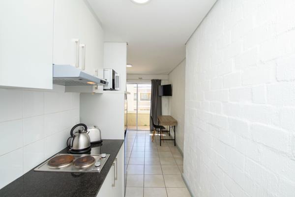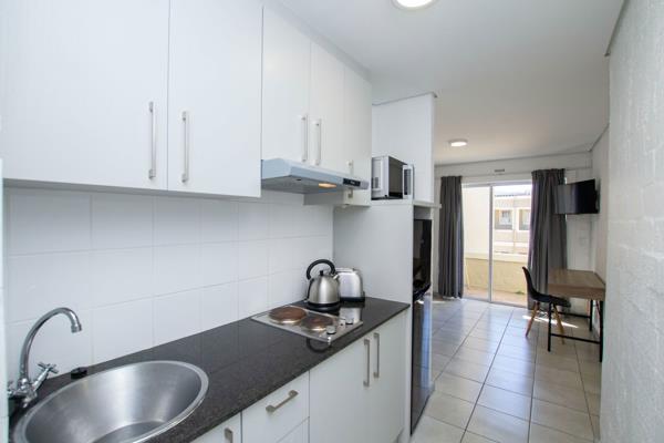 This beautifully renovated studio apartment enjoys a prime position within the complex. North-facing for optimal natural light, it also features a private balcony that enhances its open, airy feel. Designed for comfort and convenience, the apartment comes move-in ready with fitted curtains, a modern kitchen with granite countertops, a 2-plate hob, fridge/freezer combo, microwave, kettle and toaster. The bedroom area includes a bed base, mattress, desk, chair and TV. For added convenience, basement parking is available for rent or purchase. Currently rented at R9,900 per month, this apartment provides a fantastic return on investment.