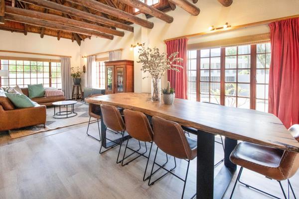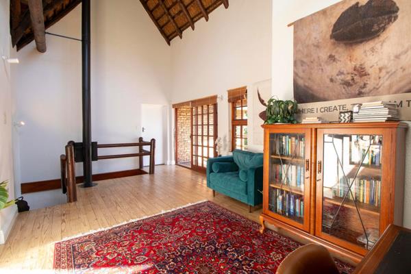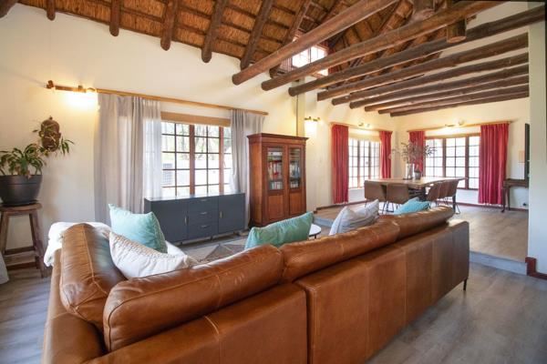 Step inside to discover a double-volume thatch roof that creates an airy, lodge-style ambiance throughout the living spaces. The home offers 7 bedrooms in total. The main bedroom of the house is a private retreat on its own generously sized, with a walk-in closet, luxurious en-suite bathroom, and tranquil views towards the Simonsberg Mountains. Two of the mentioned rooms are self-contained apartments, each with private entrances and own amenities for extended family, guests, or rental income.