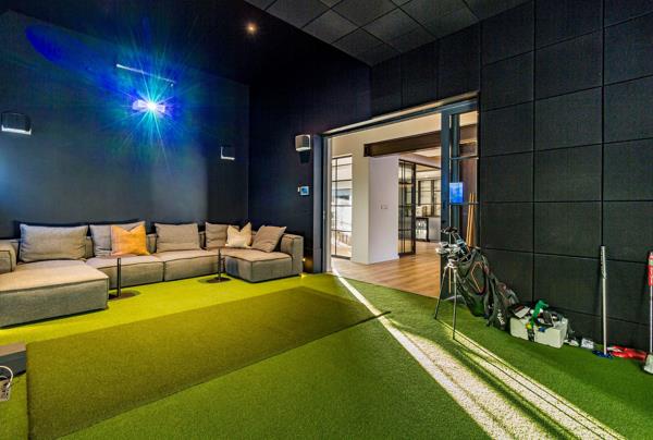 Step inside, and the open-plan living space unfolds effortlessly, centred around a sleek designer kitchen with granite countertops, a gas hob, and integrated appliances. The heart of the home extends to an entertainment wing, complete with a home theatre and golf simulator - where evenings are spent in cinematic indulgence or perfecting your swing.