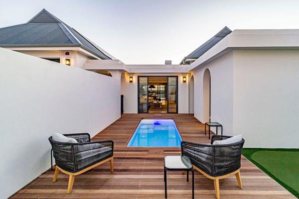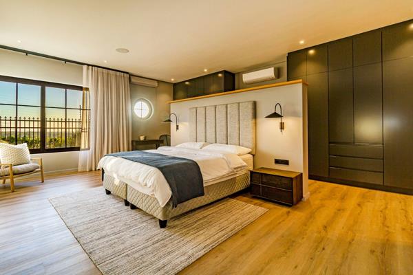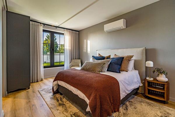 Three en-suite bedrooms offer tranquil retreats, each with air-conditioning and generous built-in storage. Large aluminium-framed windows, fitted with American shutters, frame vineyard and mountain views. Sliding doors open onto an expansive deck with a heated pool, designed for long summer afternoons and golden Cape Winelands sunsets.